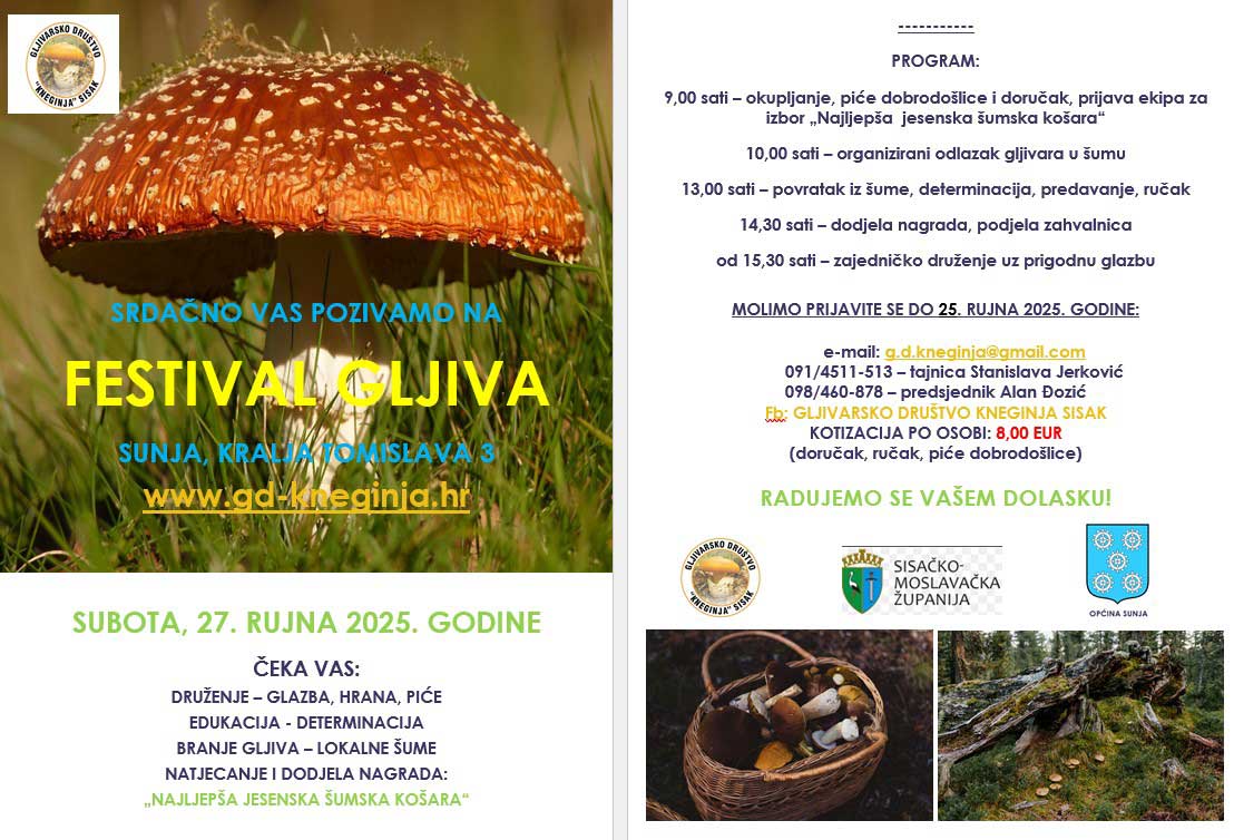 Pridružite nam se na Festivalu gljiva u Sunji u subotu, 27. rujna 2025. godine – danu ispunjenom mirisima šume, glazbom, dobrom hranom i toplim druženjem! Očekuju vas edukativne radionice, zajedničko branje gljiva u lokalnim šumama te natjecanje za „Najljepšu jesensku šumsku košaru“.